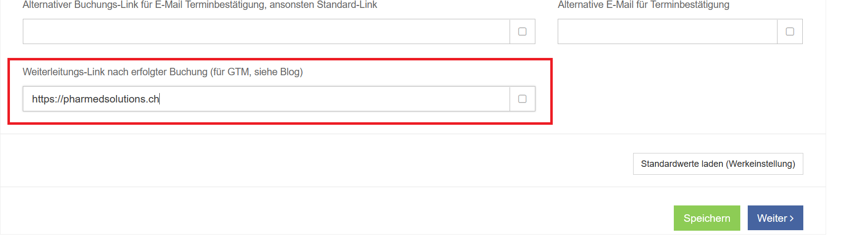 Der Link zur Webseite, auf die weitergeleitet werden soll, kann in den Einstellungen unter "Apps" - "Online-Buchung" hinterlegt werden: